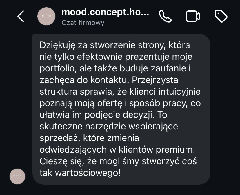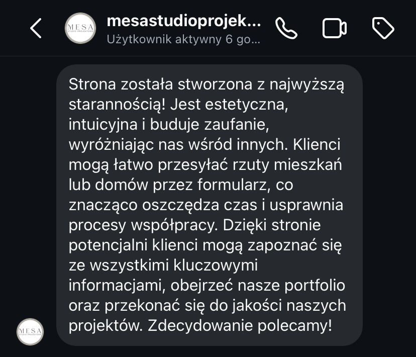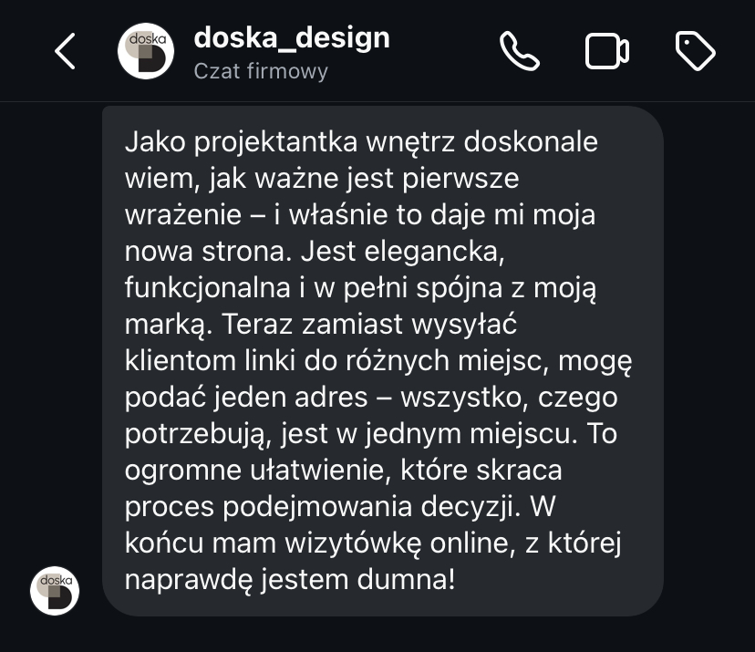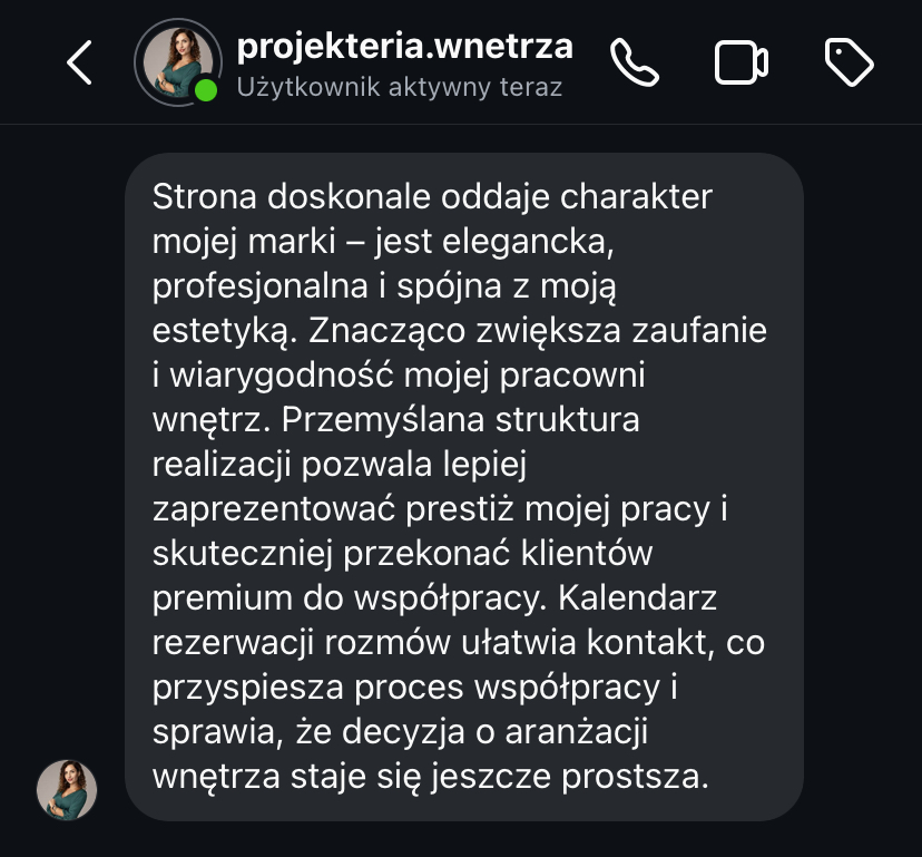 Dzięki stronie internetowej jestem bardziej widoczna na tle konkurencji i w końcu spełniam standardy biura projektowego.”